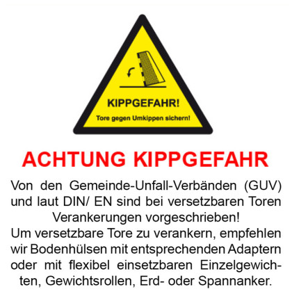 Laut GUV und DIN/ EN sind versetzbare Tore immer gegen das Umkippen zu sichern!