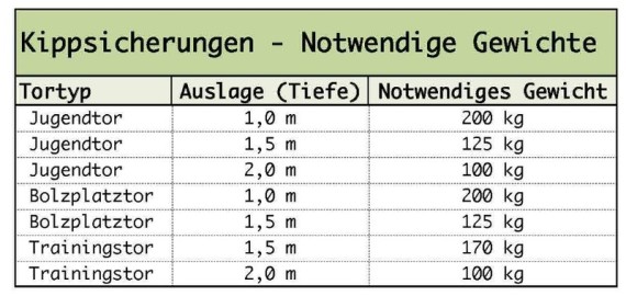 So sind bspw. bei einem Trainingstor mit einer Auslage von 2,0m 100kg Kontergewichte erforderlich, um die Standfestigkeit von 1.100N nach DIN/ EN abzusichern. Wir empfehlen Kippsicherungen in