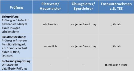 Inspektionen von Sportanlagen und damit einhergehend die Beseitigung von Mängeln sind aus gesetzlicher Sicht notwendig. Das ergibt sich aus dem BGB als auch aus den Regelwerken der Gesetzlichen Unfallkassen (GUV). Folgende Intervalle zur Überprüfung erweisen sich als sinnvoll: